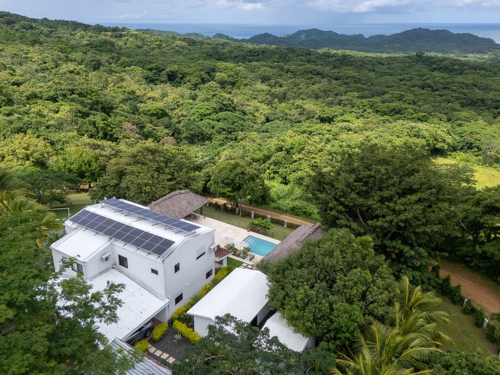 Outdoors, enjoy a true tropical oasis with a sun deck, pool, lounging areas, and fully equipped palapas ideal for entertaining. The property includes a separate guest house with kitchen—perfect for rental income—plus additional structures for storage, laundry, and staff. With solar power, backup generator, private well, and full security features, it offers both sustainability and peace of mind. Surrounded by expansive oceanview land with development potential, and located near top beaches like Maderas, Marsella, and Majagual, this partially furnished, move-in-ready estate is ideal as a luxury residence, vacation home, or high-return investment opportunity.