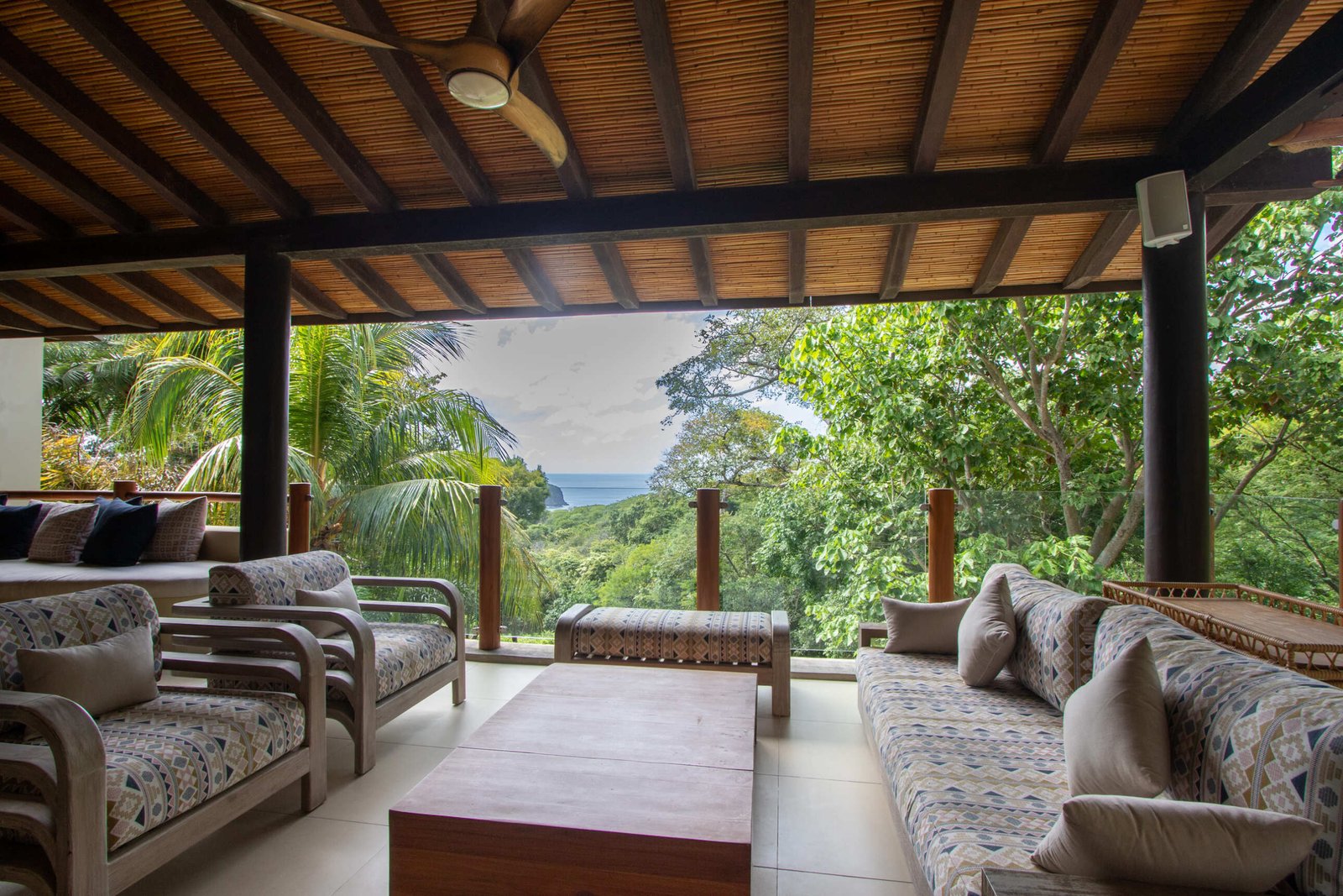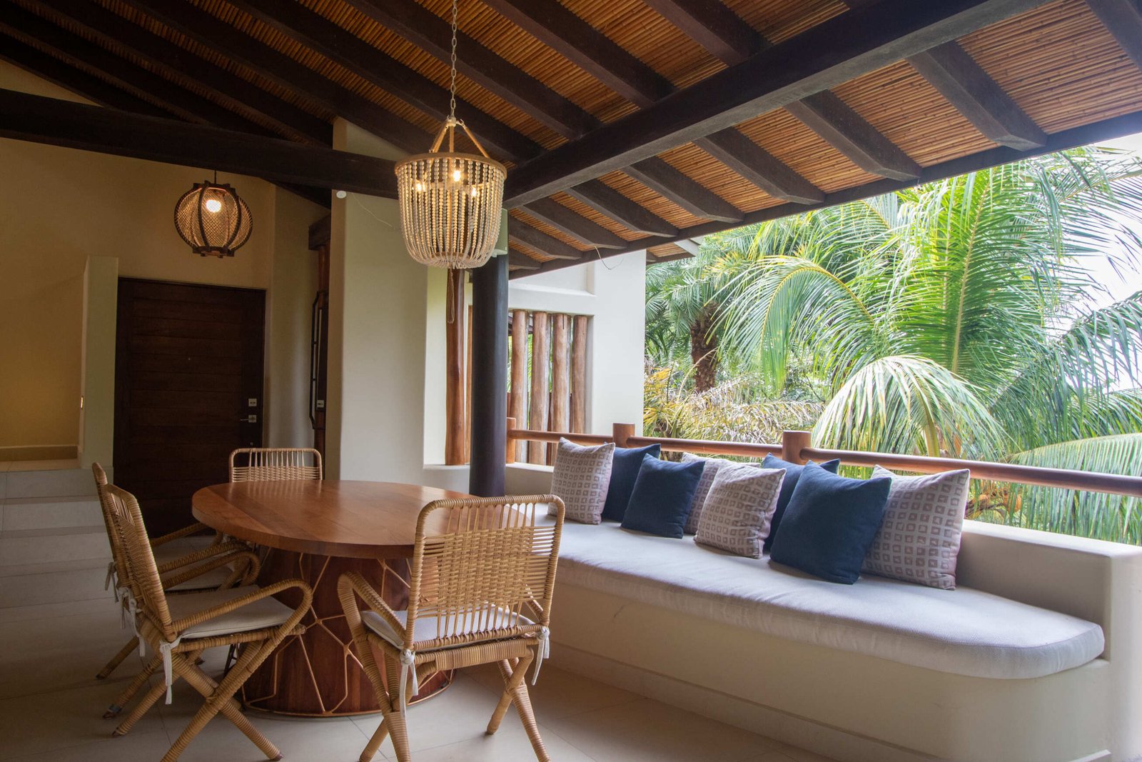Large sliding doors open onto a covered terrace, where ocean breezes and serene views enhance the indoor-outdoor living experience. Air conditioning throughout the residence, high-speed Wi-Fi, and modern amenities ensure effortless comfort year-round.